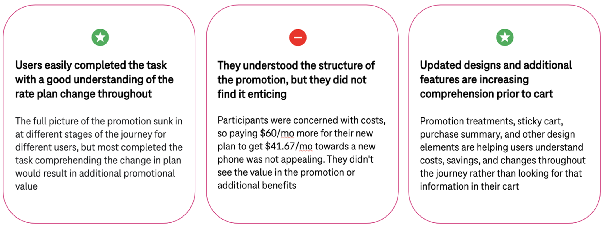 Through a variety of unmoderated and moderated user tests with UXR, UX and Product collaborated in earnest identifying a variety of use cases and conent updates that would help customers to fully comprehend the experience, pricing, and benefits of the promotional plan change upsell.