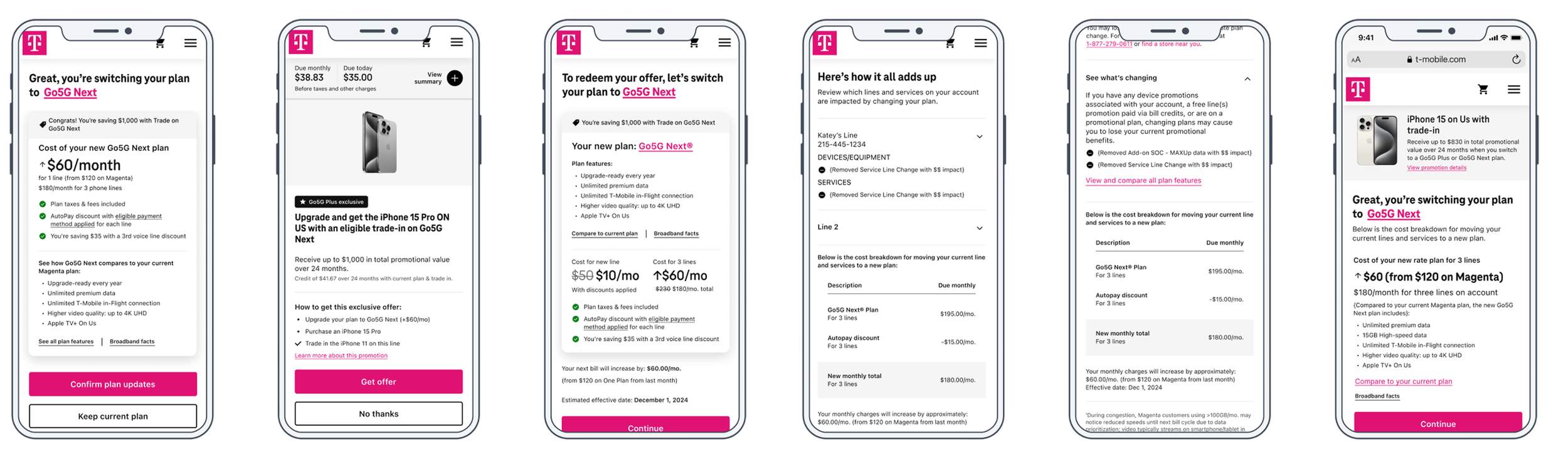 We worked with product and development to identify the correct sequencing of the upsell offer and rate plan change to determine any/all api and data challenges across our platforms. We tested these approaches to understand the mental model of our customers who would be likely to convert on a rate plan change during a device upgrade flow.